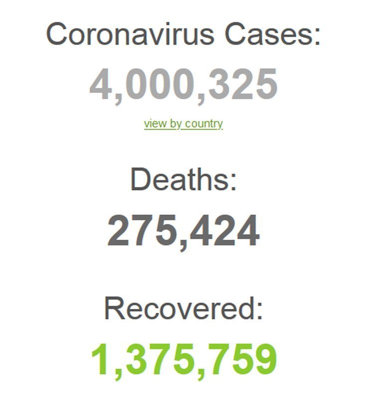 Corona virüsü salgınında gerçek zamanlı istatistikleri yayınlayan Worldometers, dünya genelinde vaka sayısının 4 milyonu geçtiğini duyurdu.