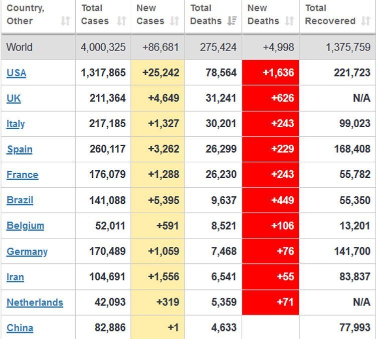 Corona virüsü salgınında gerçek zamanlı istatistikleri yayınlayan Worldometers, dünya genelinde vaka sayısının 4 milyonu geçtiğini duyurdu …