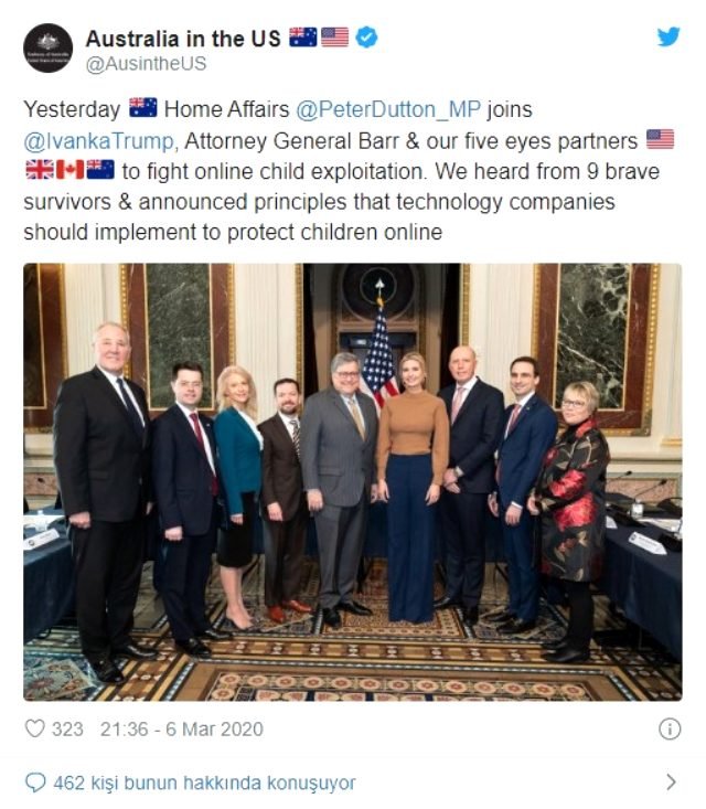 Yeni tip Koronavirüs’e (Kovid-19) yakalanan Avustralya İçişleri Bakanı Peter Dutton’un sadece birkaç gün önce 7 Mart’taABD Başkanı Donald Trump‘ın kızı ve danışmanı Ivanka Trump ve ABD Adalet Bakanı William Barr ile yan yana fotoğrafının çekildiği ortaya çıktı. Dutton’ın testinin pozitif çıkması üzerine, salgının Beyaz Saray’a da ulaşmış olabileceği spekülasyonları başladı.