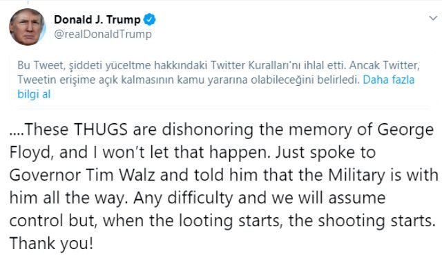 TRUMP’IN “SİLAHLAR ATEŞLENİR” TWEETİ GİZLENDİ