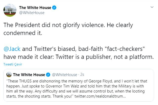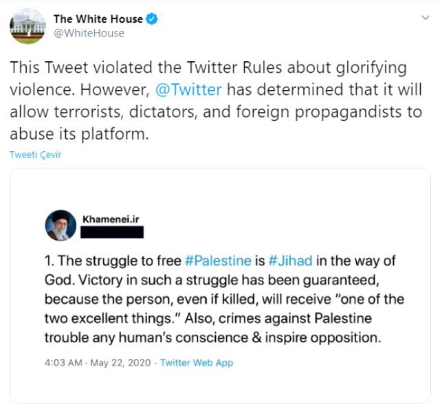 Beyaz Saray daha sonra yaptığı paylaşımda ise şu ifadeleri kullandı: “Bu tweet, Twitter’ın şiddeti yüceltme ile ilgili kurallarını ihlal ediyor ama Twitter; teröristler, diktatörler ve yabancı propagandacılara bu platformu kötü niyetli bir şekilde kullanmalarına izin vermeye kararlıdır.”