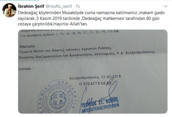Şerif, mahkeme kararıyla ilgili sosyal medya hesabından yaptığı paylaşımda, “Dedeağaç köylerinden Musaköy’de cuma namazına katılmamız, makam gasbı sayılarak, 5 Kasım 2019 tarihinde, Dedeağaç mahkemesi tarafından 80 gün cezaya çarptırıldık. Hayırlısı Allah’tan.” ifadelerini kullandı.