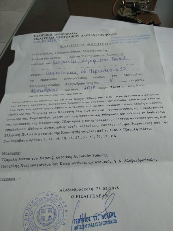 Yunanistan’da, Dedeağaç (Aleksandrupolis) Asliye Mahkemesi, Gümülcine müftüsü İbrahim Şerif’i, Dedeağaç bölgesindeki bir Türk köyünde kılınan Cuma namazına iştirak ettiği için suçlu buldu.