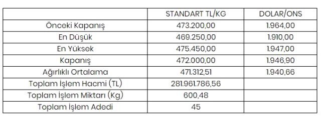 Borsa İstanbul Kıymetli Madenler ve Kıymetli Taşlar Piyasası’nda (KMKTP), altında gerçekleşen toplam işlem hacmi 281 milyon 961 bin 786,56 lira, işlem miktarı ise 600,48 kilogram oldu. Tüm metallerdeki toplam işlem hacmi ise 326 milyon 932 bin 923,85 lira oldu.