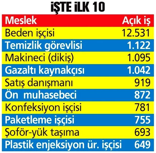 Özel sektör; acilen bin 122 temizlik görevlisi, bin 95 makineci (dikiş) arıyor. Bin 42 kişiyle gazaltı kaynakçısı, 919 kişiyle satış danışmanı, 872 kişiyle ön muhasebeci en çok aranan elemanlar arasında yer alıyor. İş arayanlar, isterse İŞKUR’un internet sitesinden isterse en yakın İŞKUR İl Müdürlüğü aracılığıyla üye olup, kendisine uygun işe başvurabiliyor.