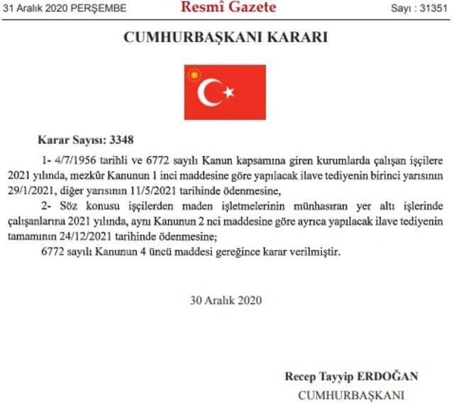 Kamuda çalışan işçilere verilecek tediye tarihleri Cumhurbaşkanı Recep Tayyip Erdoğan tarafından belirlendi. Resmi Gazete’de yer alan bilgilere göre, ilave tediyenin birinci yarısının 29/01/2021, diğer yarısının 11/05/2021 tarihinde ödenmesine, yer altı işlerinde çalışanlara ise ilave tediyenin tamamının 24/12/2021 tarihinde ödenmesine karar verildi.