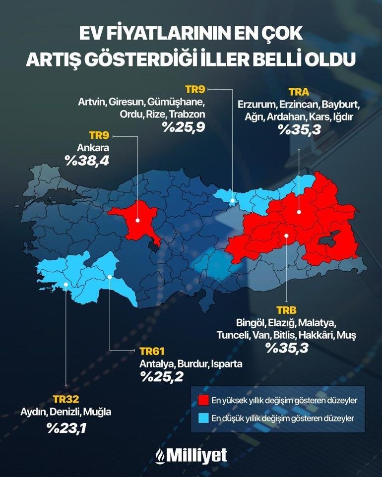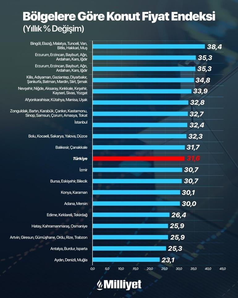Buna nazaran İstanbul ve İzmir’de fiyatlar enflasyonun altında artarken, Ankara’da fiyatlarda gerçek bazlı yükseliş dikkat çekti. Ankara’nın akabinde fiyatı en çok artan kentler doğu vilayetleri oldu. Bu bölgelerde fiyat artışları %35 düzeylerinde kaldı.