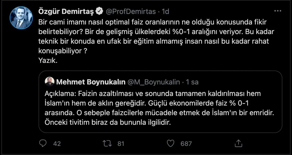 Boynukalın’ın bu açıklamalarına ekonomist Prof. Dr. Özgür Demirtaş’tan teki geldi. Demirtaş, Boynukalın’ın faiz paylaşımını alıntılayıp “Bir cami imamı nasıl optimal faiz oranlarının ne olduğu konusunda fikir belirtebiliyor? Bir de gelişmiş ülkelerdeki %0-1 aralığını veriyor. Bu kadar teknik bir konuda en ufak bir eğitim almamış insan nasıl bu kadar rahat konuşabiliyor? Yazık.” dedi.