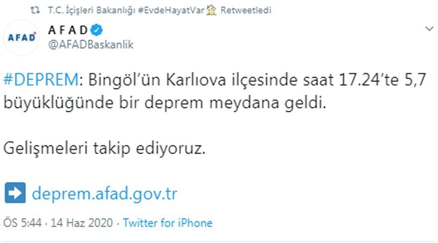 Afet ve Acil Durum Yönetimi Başkanlığı (AFAD) ise Karlıova depreminin büyüklüğünü 5,7 olarak açıkladı. Açıklamada gelişmelerin takip edildiği duyuruldu.