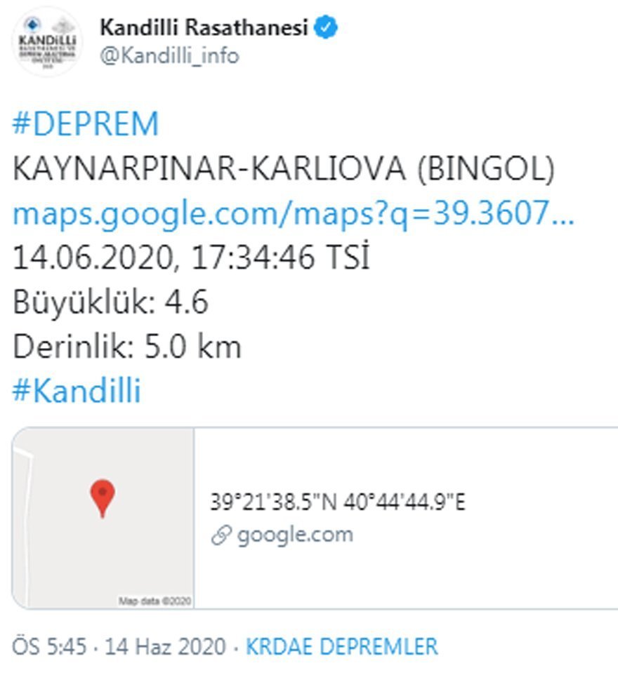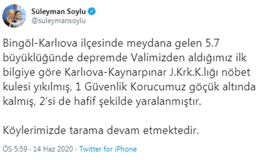 Soylu, paylaşımında, “Bingöl-Karlıova ilçesinde meydana gelen 5.7 büyüklüğünde depremde Valimizden aldığımız ilk bilgiye göre Karlıova-Kaynarpınar J.Krk.K.lığı nöbet kulesi yıkılmış, 1 Güvenlik Korucumuz göçük altında kalmış, 2’si de hafif şekilde yaralanmıştır. Köylerimizde tarama devam etmektedir” dedi.