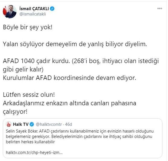 Bakanlık Sözcüsü İsmail Çataklı yaptığı açıklamada ” Böyle bir şey yok! Yalan söylüyor demeyelim de yanlış biliyor diyelim. AFAD 1040 çadır kurdu. (268’i boş, ihtiyacı olan istediği gibi gelir kalır) Kurulumlar AFAD koordinesinde devam ediyor. Lütfen sessiz olun! Arkadaşlarımız enkazın altında canları pahasına çalışıyor!” ifadelerini kullandı.