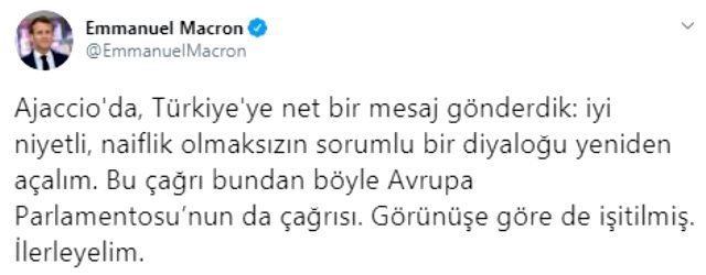 Fransa Cumhurbaşkanı Macron, bugün Twitter hesabından Türkçe bir mesaj paylaştı. Türkiye’ye seslenen Macron, “İyi niyetli, naiflik olmaksızın sorumlu bir diyaloğu yeniden açalım. Bu çağrı bundan böyle Avrupa Parlamentosu’nun da çağrısı. Görünüşe göre de işitilmiş. İlerleyelim” ifadelerini kullandı.