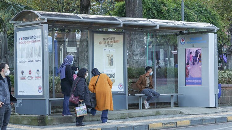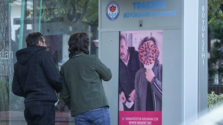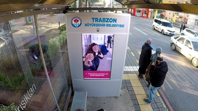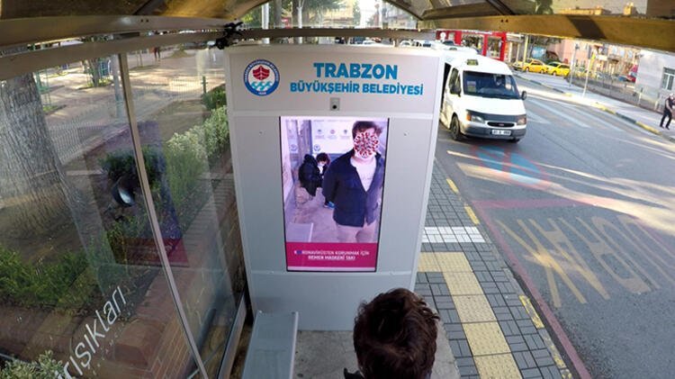 Trabzon Büyükşehir Belediyesi, koronavirüs tedbirleri kapsamında maske takma konusunda farkındalık yaratmak için, otobüs durağına yapay zekâ tabanlı dijital ekran yerleştirildi.