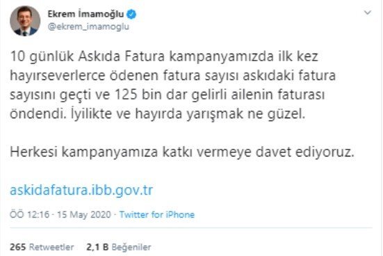 İyilikte ve hayırda yarışmak ne güzel. Herkesi kampanyamıza katkı vermeye davet ediyoruz. https://askidafatura.ibb.gov.tr