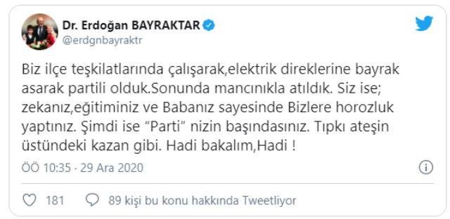 Eski Çevre ve Şehircilik Bakanı Selçuk Bayraktar, geçen yılın son gününde sosyal medya hesabından dikkat çeken bir paylaşımda bulunmuş ve “Biz ilçe teşkilatlarında çalışarak, elektrik direklerine bayrak asarak partili olduk. Sonunda mancınıkla atıldık. Siz ise; zekanız, eğitiminiz ve babanız sayesinde bizlere horozluk yaptınız. Şimdi ise “Parti”nizin başındasınız. Tıpkı ateşin üstündeki kazan gibi. Hadi bakalım, hadi!” ifadelerini kullanmıştı.