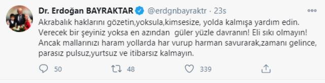 Sosyal medya hesabından yeni bir paylaşım yapan Bayraktar, bu kez “Haram mal” ve “itibar” vurgusu yaptı. “Akrabalık haklarını gözetin, yoksula, kimsesize, yolda kalmışa yardım edin. Verecek bir şeyiniz yoksa en azından güler yüzle davranın! Eli sıkı olmayın! Ancak mallarınızı haram yollarda har vurup harman savurarak, zamanı gelince, parasız pulsuz, yurtsuz ve itibarsız kalmayın” ifadelerini kullanan Eski Bakan Bayraktar’a çok sayıda sosyal medya kullanıcısı ise 2013 yılında yaşadığı kötü durumu dile getiren kanser hastası Dilek Özçelik‘le arasındaki diyaloğu hatırlattı.