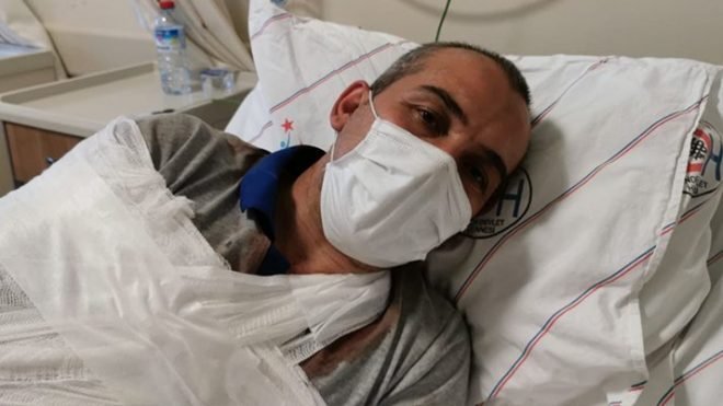 * Yolda bir sağlık ekibi denk geldi, ambulansla buraya getirdiler beni. Patlama sesleri geldikçe biz bölgeden uzaklaşmaya çalıştık, yürüyerek aşağıdaki köye kadar gittik yani.