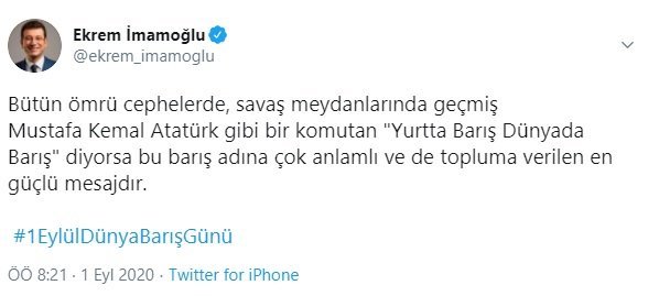 Twitter hesabından paylaşımda bulunan İmamoğlu, “Bütün ömrü cephelerde, savaş meydanlarında geçmiş Mustafa Kemal Atatürk gibi bir komutan “Yurtta Barış Dünyada Barış” diyorsa bu barış adına çok anlamlı ve de topluma verilen en güçlü mesajdır” dedi.