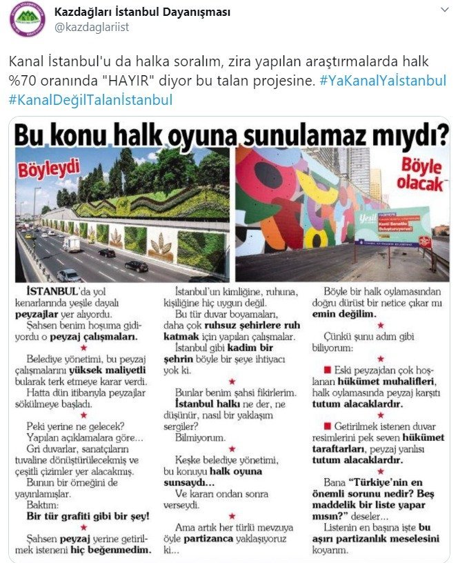 Sosyal medyada bazı kullanıcılar, Hürriyet Genel Yayın Yönetmeni Ahmet Hakan’ın bugünkü köşe yazısında İBB’nin yeni projesi için belediyeye “Bu konu halk oylamasına sunulamaz mıydı?” diye soran Ahmet Hakan’a tepki gösterdi. Bazı kullanıcılar, Hakan’ın yazısını ‘Kanal İstanbul için de aynısını öner’ diyerek eleştirdi.