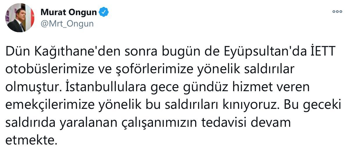 * Dün Kağıthane’den sonra bugün de Eyüpsultan’da İETT otobüslerimize ve şoförlerimize yönelik saldırılar olmuştur.