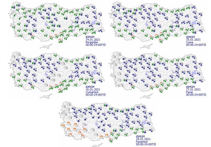 Meteoroloji Genel Müdürlüğü tarafından yapılan son değerlendirmelere göre: Ülkemiz genelinin çok bulutlu ve aralıklı yağışlı geçeceği tahmin ediliyor. Genellikle yağmur ve sağanak, Trakya, Marmara’nın güneyi, İç Ege, Batı Akdeniz’in iç ve yüksek kesimleri, İç Anadolu, Karadeniz’in iç kesimleri ile Doğu Anadolu’da karla karışık yağmur ve kar şeklinde olması beklenen yağışların;
