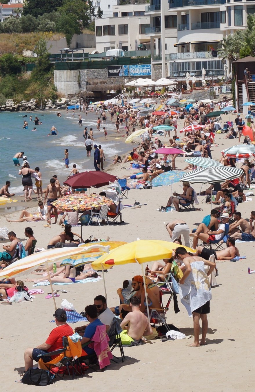 Hafta sonunda güneşli havanın tadını çıkarmak isteyenler Kuşadası plajlarını doldurdu. Sabah saatlerinde uygulanan sosyal mesafe kuralları, günün ilerleyen saatlerinde plajın dolmasıyla kenara bırakıldı.