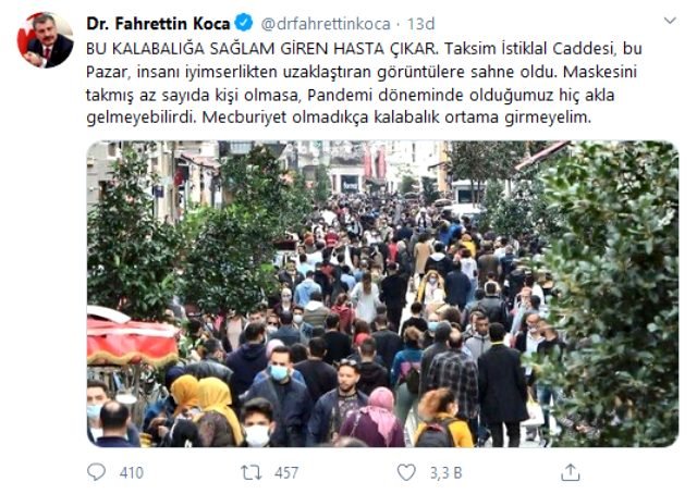 İstanbul’un sembol yerlerinden biri olan Taksim Meydanı’nın koronavirüs öncesi günlerini aratmağı kalabalık görüntüsüne Sağlık Bakanı Koca, tepki gösterdi.