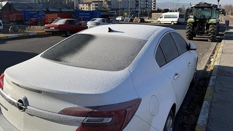 Gece hava sıcaklığının sıfırın altında 7 dereceye düştüğü Kars’ta da araç camları buz tuttu, bitki ve ağaçlarda kırağı meydana geldi.
