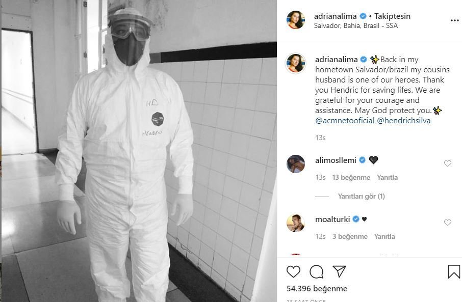 Dünyaca ünlü model Adriana Lima, Instagram hesabından yaptığı paylaşımla, başta kuzeninin eşi Hendric olmak üzere tüm sağlık çalışanlarına teşekkür etti ve “Memleketim Salvador’da kahramanlarımızdan biri de kuzenimin kocası. Kurtardığın hayatlar için teşekkürler hendric. Cesaretin ve yardımların için teşekkürler. Tanrı seni korusun” dedi…