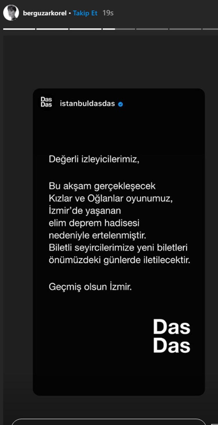 Çıkarken bir hayli üzgün olduğu gözlenen Korel, sosyal medya hesabından yaptığı açıklamayla da İzmir depremi sebebiyle üzgün olduklarını ve bu şartlarda oyunun ileri bir tarihe ertelendiğini duyurdu.