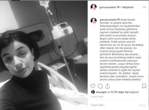 Oyuncu Gonca Vuslateri, ağır grip nedeniyle hastanelik oldu. Vuslateri’nin sağlık durumu nedeniyle Fırat Tanış ile birlikte rol aldığı oyun da ertelendi.