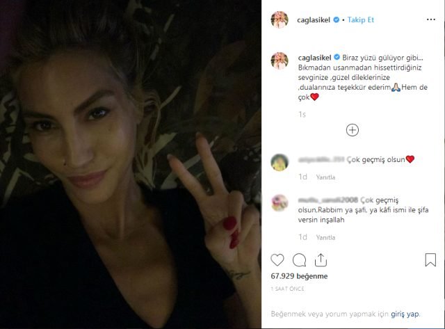 Şikel ayrıca sosyal medya hesabından taburcu olduktan sonra “Biraz yüzü gülüyor gibi… Bıkmadan usanmadan hissettirdiğiniz sevginize, güzel dileklerinize, dualarınıza teşekkür ederim. Hem de çok” notunu düşerek yeni bir fotoğraf paylaştı. Çağla Şıkel’in bu paylaşımına kısa sürede binlerce beğeni ve yorum geldi.