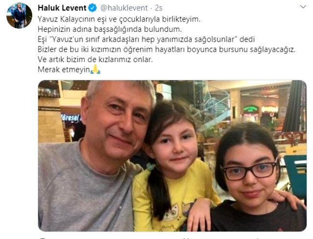 Şarkıcılığın yanı sıra kurucusu olduğu AHBAP derneği ile yaptığı yardımlarla takdir toplayan Haluk Levent, hayatını kaybeden Yavuz Kalaycı’nın ailesiyle buluştu. Bu haberi Twitter hesabından duyuran şarkıcı, “Yavuz Kalaycı’nın eşi ve çocuklarıyla birlikteyim. Hepinizin adına başsağlığında bulundum. Eşi ‘Yavuz’un sınıf arkadaşları hep yanımızda sağ olsunlar’ dedi. Bizler de bu iki kızımızın öğrenim hayatları boyunca bursunu sağlayacağız. Ve artık bizim de kızlarımız onlar. Merak etmeyin” dedi.
