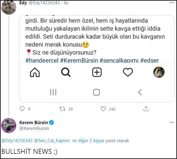 Herkes haberin doğruluğunu öğrenmeye çalışırken oyuncu Kerem Bürsin’den yanıt geldi. Bürsin kavga iddialarıyla ilgili atılan tweet’e yorum yaptı. Bürsin, haberlerin doğru olmadığını söyledi.