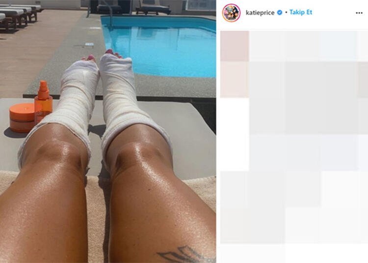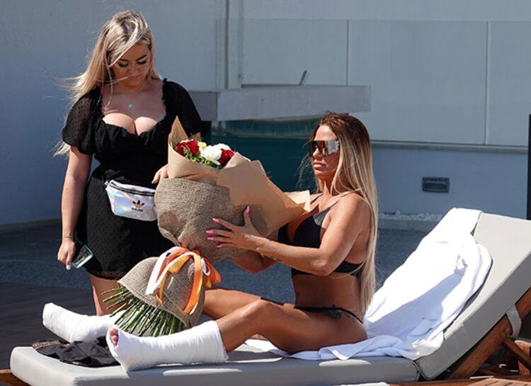Price son görüntülendiğinde ise iki bacağının da alçıda olmasıyla şaşırttı. Bir arkadaşı; şezlongda güneşlenen Price’a büyük bir buket çiçek getirdi.