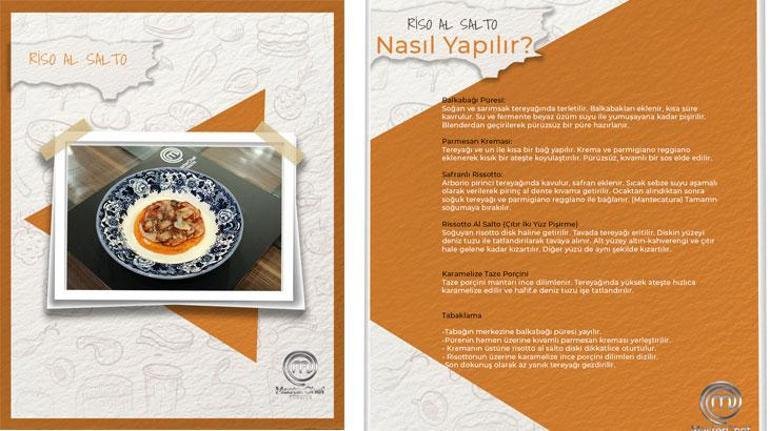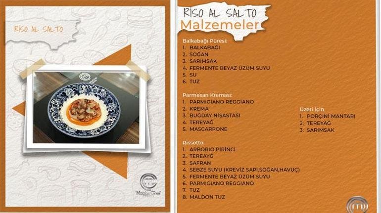 Yarışmacılar Danilo Şef’in lezzetli tabağı Ri,so Al Salto’yu yaptı. Harikulade tabaklar hazırlayan yarışmacılar şeflerden notlar aldı. İşte Danilo Şef’in lezzetli tabağının tanımı…