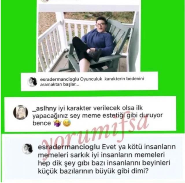 Esra Dermancıoğlu paylaşımına “Oyunculuk karakterin bedenini aramaktan başlar…” notunu düştü. Bir takipçisi ise ünlü oyuncunun göğüsleriyle ilgili bir yorumda bulunup, “İyi karakter verilecek olsa ilk yapacağınız şey meme estetiği gibi duruyor” dedi.