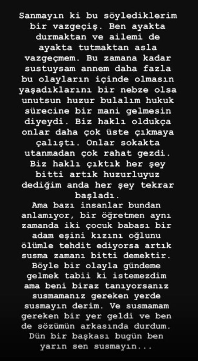 Ben böyle şeyler karşısında hiç susmam! Bir kadın olarak asla susmam, bir kadının dışında bir evlat olarak ailemi asla böyle şeylere ezdirmem. Bu süreç yine adliyeye taşınacak ama ben buradan halka açık bir suç duyurusu yapmak istiyorum. Babam ve ailesi tarafından tehdit edilmeye başlandık. Bunları ben avukatımla beraber adli sürece de dökeceğiz en kısa zaman içinde. Buradan bunu belirtiyorum çünkü bir şeylerin hep üzeri kapalı olacağını sanıyor bazı insanlar. Adli süreç ne zaman olur bilmiyorum ama biz tehdit almaya başladık. Bu videoyu da izleyecektir bizi tehdit edenler. Ben asla kendimi ve ailemi ezdirmem bu halka açık bir suç duyurusudur.”