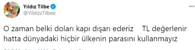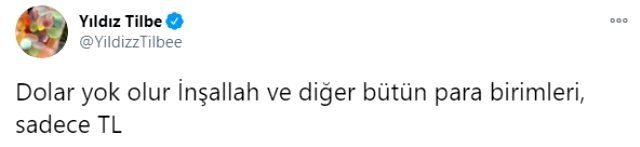 Ağustos ayında “TL basıyorsak dolar da basarız ne yani?” diye açıklama yapan Tilbe, bu sefer de “Doların Allah belasını versin! Dolar yok olur inşallah ve diğer bütün para birimleri, sadece TL. Ya da TL aradan kalksın dolar kullanalım her şey dolar üzeri TL olmasın yazık TL paramıza, arada kalmasın” dedi.