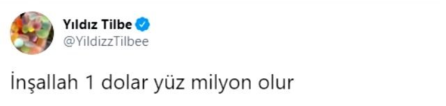 Dolar/TL’deki yükselişe ünlü şarkıcı Yıldız Tilbe de sessiz kalamadı. Twitter hesabından peş peşe paylaşımlar yapan Tilbe, önce “İnşallah 1 dolar yüz milyon olur” dedi. Sonra da gündem olan paylaşımlarına devam etti.
