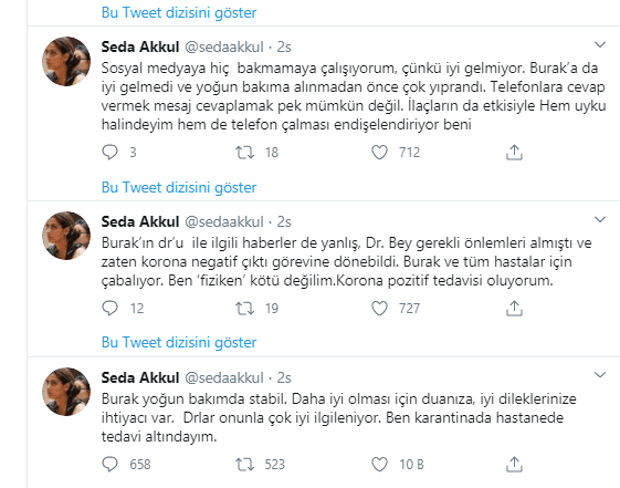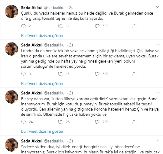 Bir şey daha var lütfen, ‘Ülkeye korona getirdiniz’ yazmaktan vazgeçin Buna inanmıyorum, Burak için kötü düşünmeyin. Burak tonsilit sebebi ile tedavi oluyordu. Ben ailemin yanına gittiğimde korona haberleri henüz Çin ve İtalya ile sınırlıydı. Ülkemizde hiç vaka haberi yoktu ve Londra’da da henüz tek bir vaka açıklanmış iyileştiği bildirilmişti. Çin, İtalya ve İran dışında ülkelere seyahat etmememiz için bir açıklama, uyarı yoktu. Burak yanıma geldiğinde bu hafta yayına girmesi gereken ‘yeni bölüm sorumlululuğu’ ile hareket ediyordu” ifadelerini kullandı.
