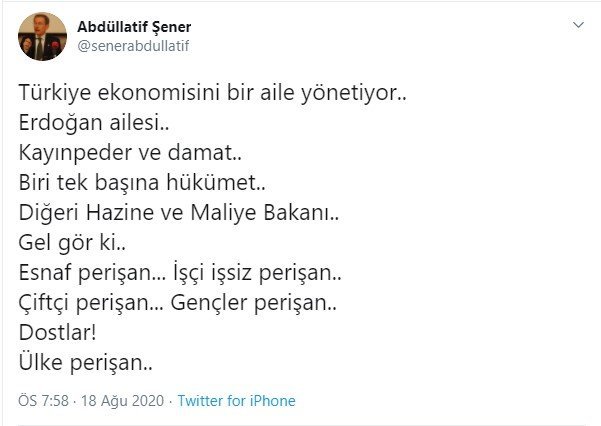 ”Türkiye ekonomisini bir aile yönetiyor.. Erdoğan ailesi.. Kayınpeder ve damat.. Biri tek başına hükümet.. Diğeri Hazine ve Maliye Bakanı.. Gel gör ki.. Esnaf perişan… İşçi işsiz perişan.. Çiftçi perişan… Gençler perişan.. Dostlar! Ülke perişan..”