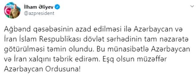 Öte yandan, Ağbend kasabasının kurtarılmasıyla Karabağ’ın İran sınırı tamamıyla Azerbaycan’ın kontrolüne geçti.