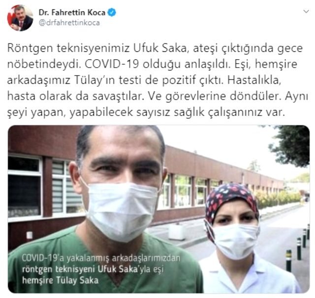 Koca, Twitter hesabından, Kovid-19’u yenen sağlık çalışanı Ufuk ve Tülay Saka çiftine ilişkin paylaşımda bulundu. Röntgen teknisyeni Ufuk Saka’nın, ateşi çıktığında gece nöbetinde olduğunu belirten Koca, “Kovid-19 olduğu anlaşıldı. Eşi, hemşire arkadaşımız Tülay’ın testi de pozitif çıktı. Hastalıkla, hasta olarak da savaştılar ve görevlerine döndüler. Aynı şeyi yapan, yapabilecek sayısız sağlık çalışanınız var.” değerlendirmesinde bulundu.