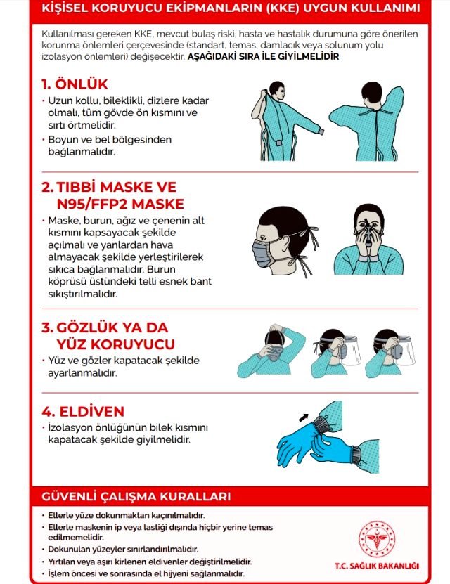• Enfekte olduysanız eğer, mesafeyi korumanın, öksürürken, hapşırırken tek kullanımlık kağıt mendil ile ağızın ve burnun kapatılmasının; kağıt mendilin bulunmadığı durumlarda ise dirsek içinin kullanılmasının, ellerin yıkanmasının; gözlerinize, burnunuza ve ağzınıza dokunmaktan kaçınmanın,