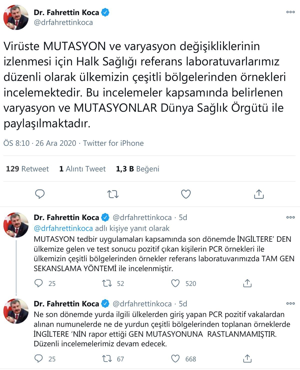 Sağlık Bakanı Fahrettin Koca da mutasyonlu corona virüsüyle ilgili sosyal medya hesabından paylaşımlar yaptı.