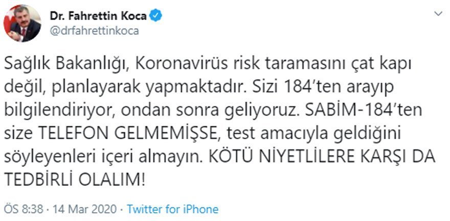 * Sağlık Bakanlığı, Koronavirüs risk taramasını çat kapı değil, planlayarak yapmaktadır.