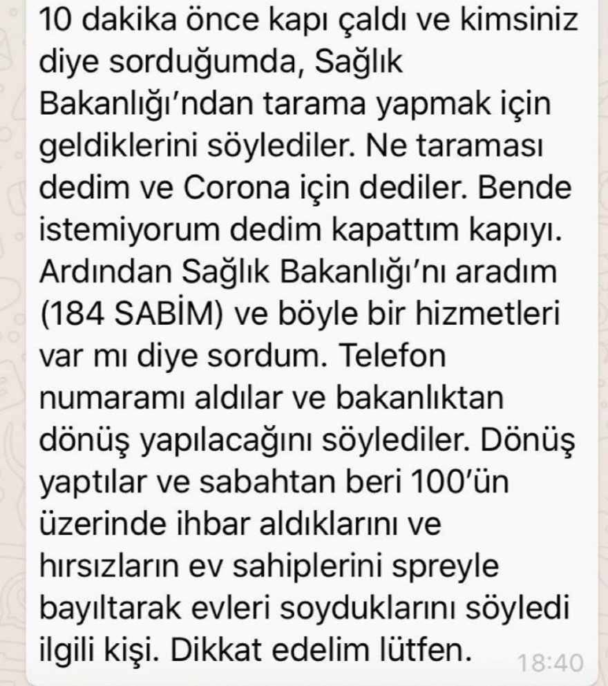 * 10 dakika önce kapı çaldı ve kimsiniz diye sorduğumda, Sağlık Bakanlığı’ndan tarama yapmak için geldiklerini söylediler.