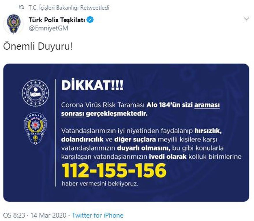 Emniyet Genel Müdürlüğü (EGM) de dolandırıcılara karşı uyardı. EGM’nin açıklamasında Corona virüsü risk taramasının Alo 184’ün araması sonrası gerçekleştiği belirtildi.