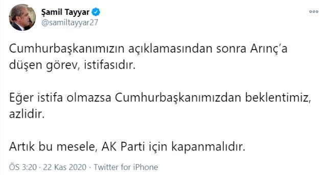 “Cumhurbaşkanımızın açıklamasından sonra Arınç’a düşen görev, istifasıdır. Eğer istifa olmazsa Cumhurbaşkanımızdan beklentimiz, azlidir. Artık bu mesele, AK Parti için kapanmalıdır.”